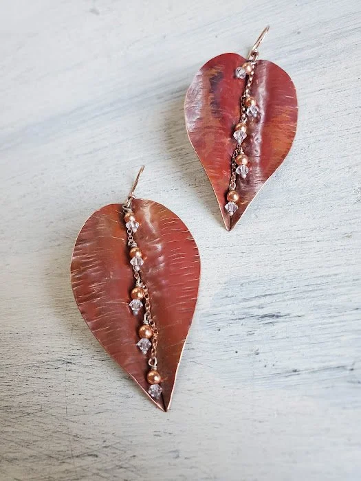 Made from very thin gauge Copper sheet metal, these leaves have been hand cut, flame treated to bring out the colors from oxidation, folded, hammered and formed. Completed with a center dangle made from 14kt Rose Gold chain, Sterling Silver, and Crystal beads. Ear wires handmade from 14kt Rose Gold filled wire. These earrings weigh approximately 3 grams each.