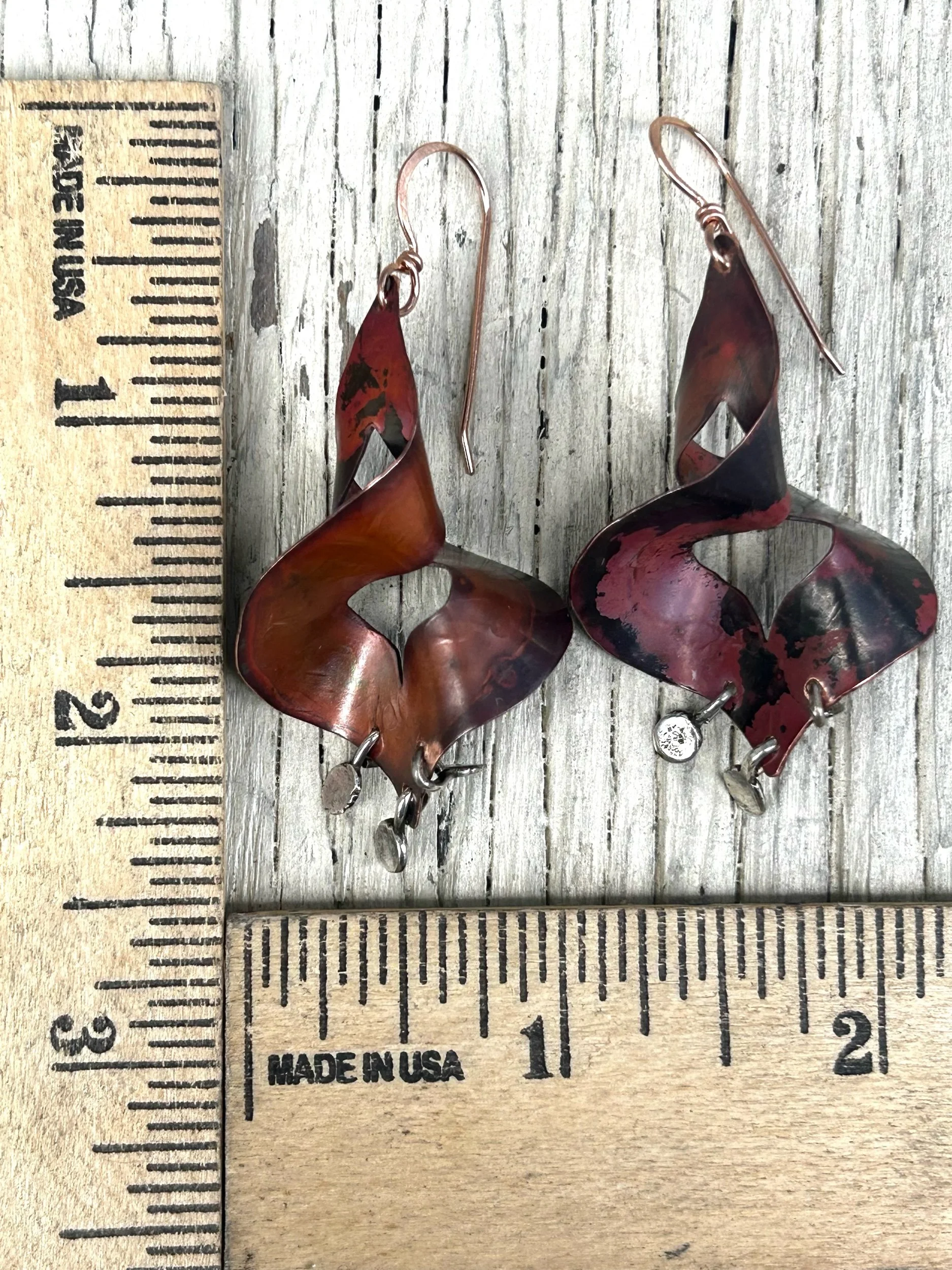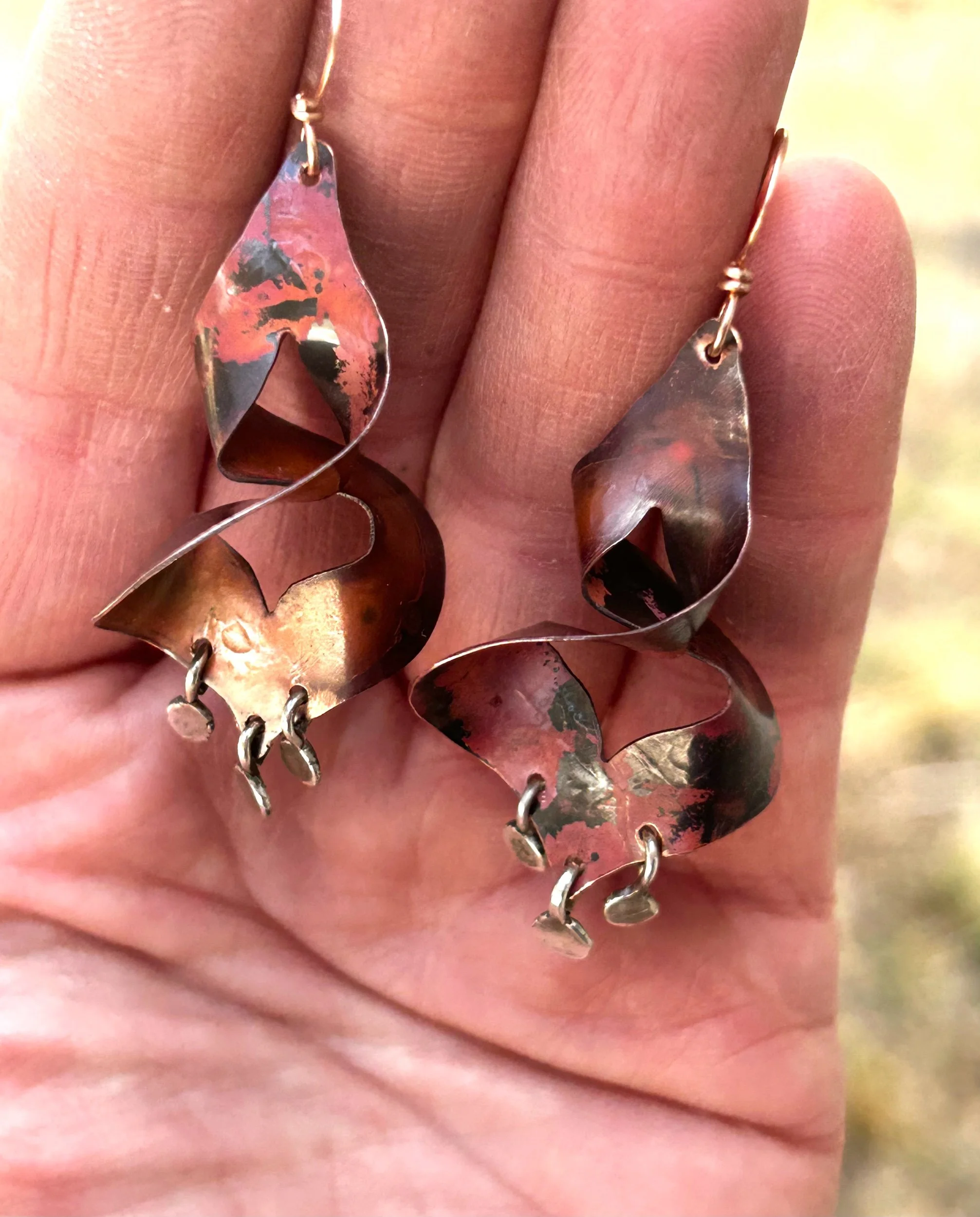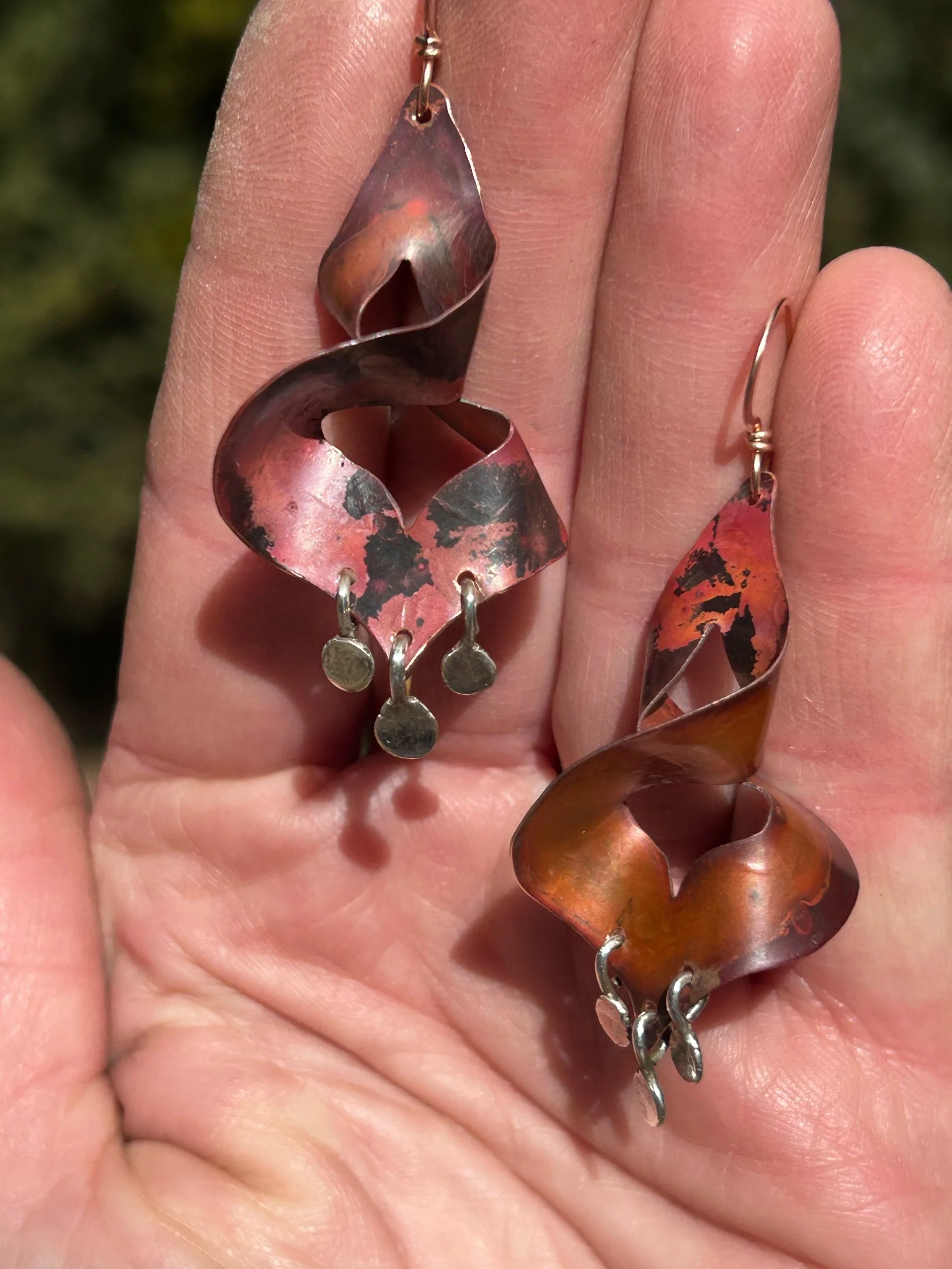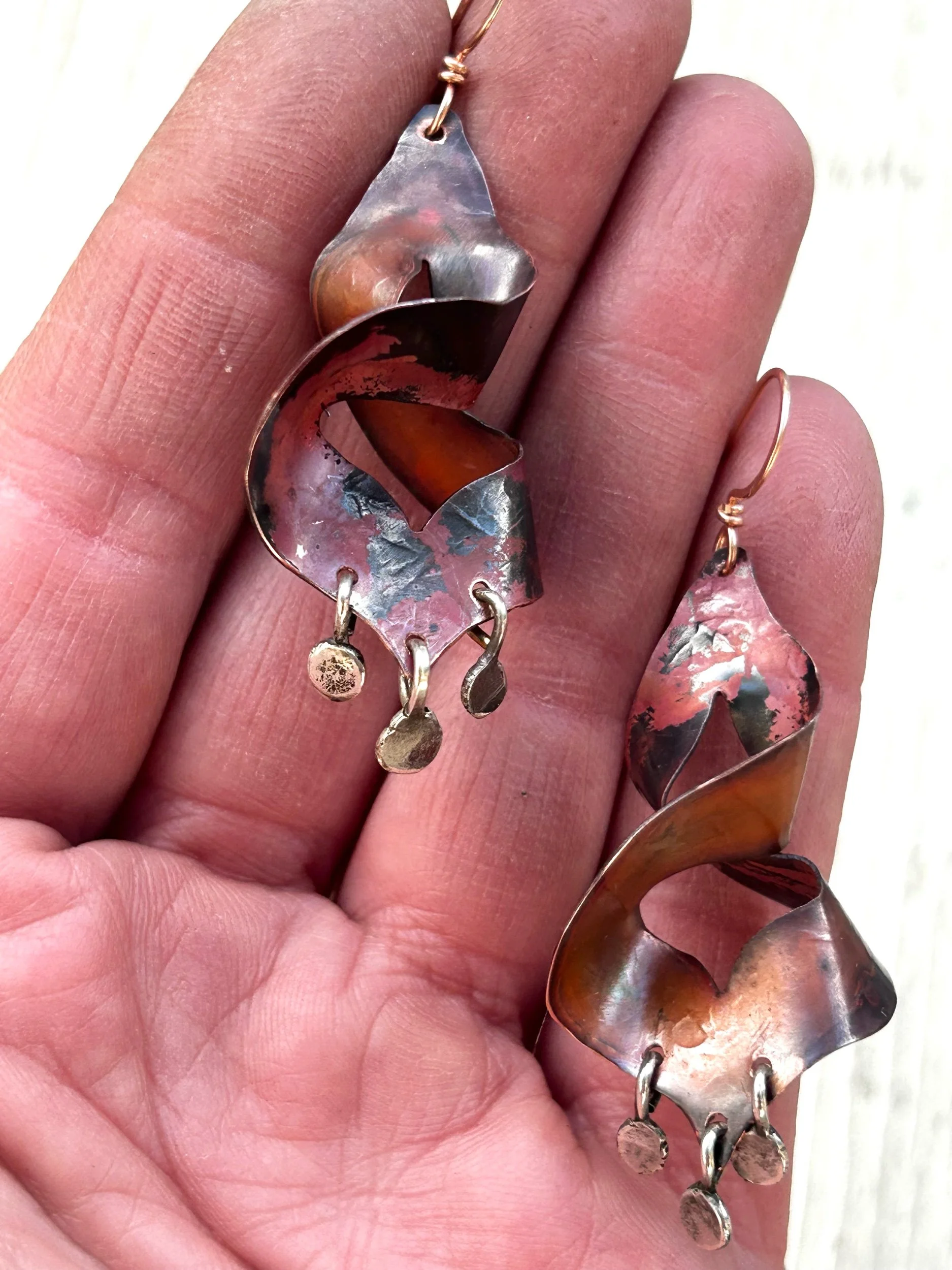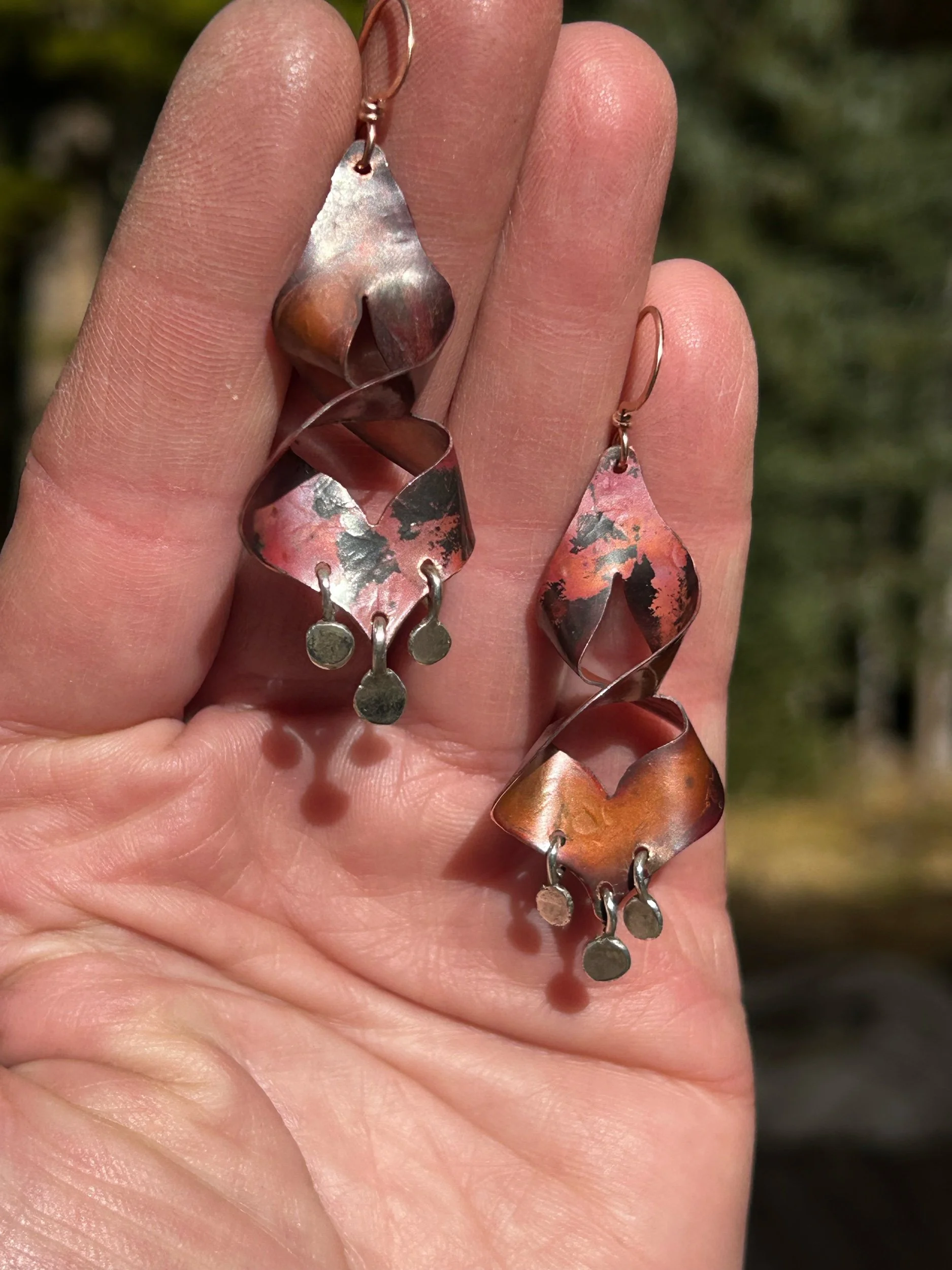 Thin copper sheet that’s been cut to shape, hammer-textured, heat-treated to bring out the colors from oxidation, twisted and formed. Dangles of hammered Sterling Silver & Handmade 14kt Rose Gold-filled French hook style ear wires. Each piece weighs approximately 3 grams. One of a kind and ready to ship.