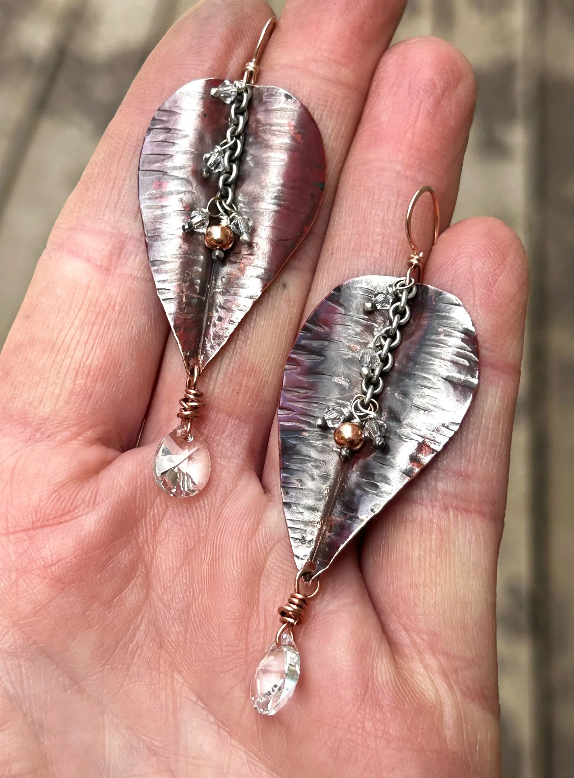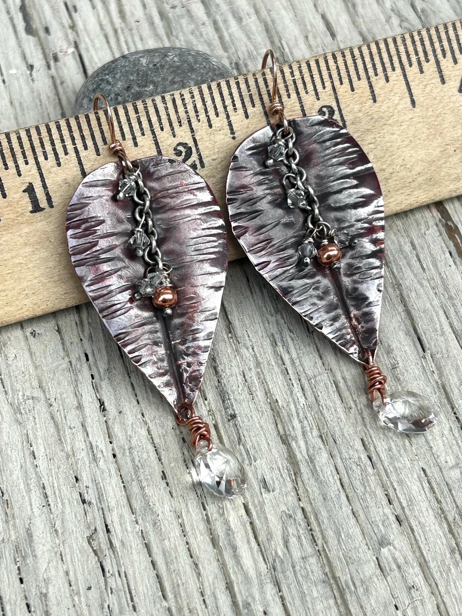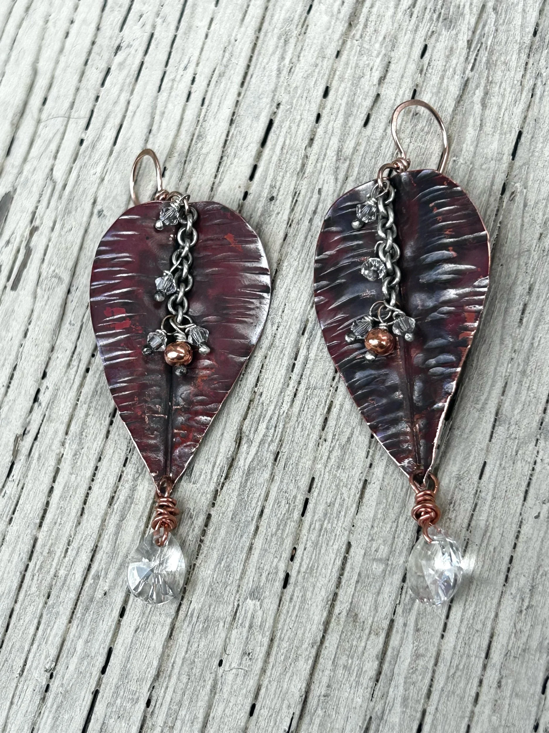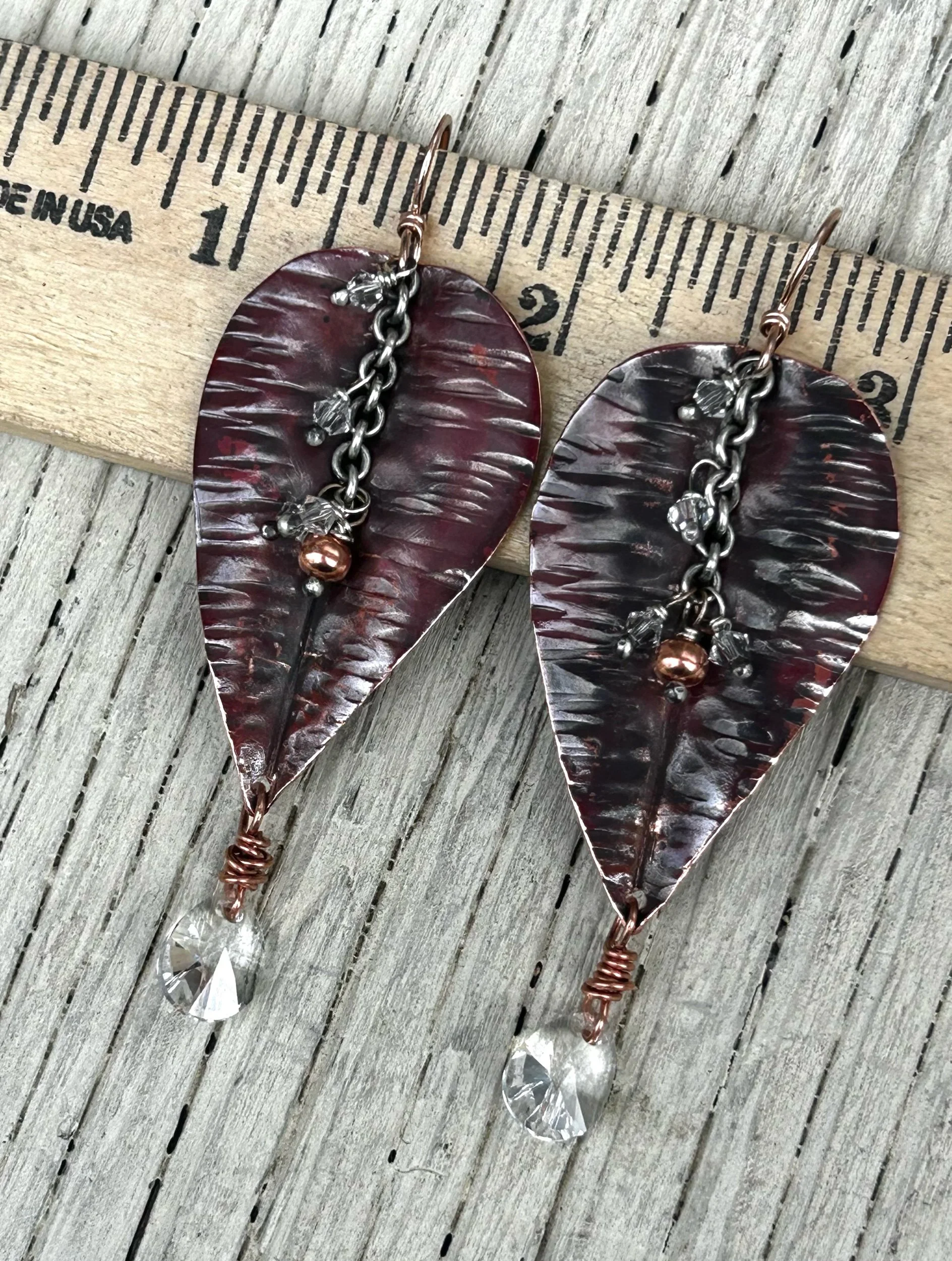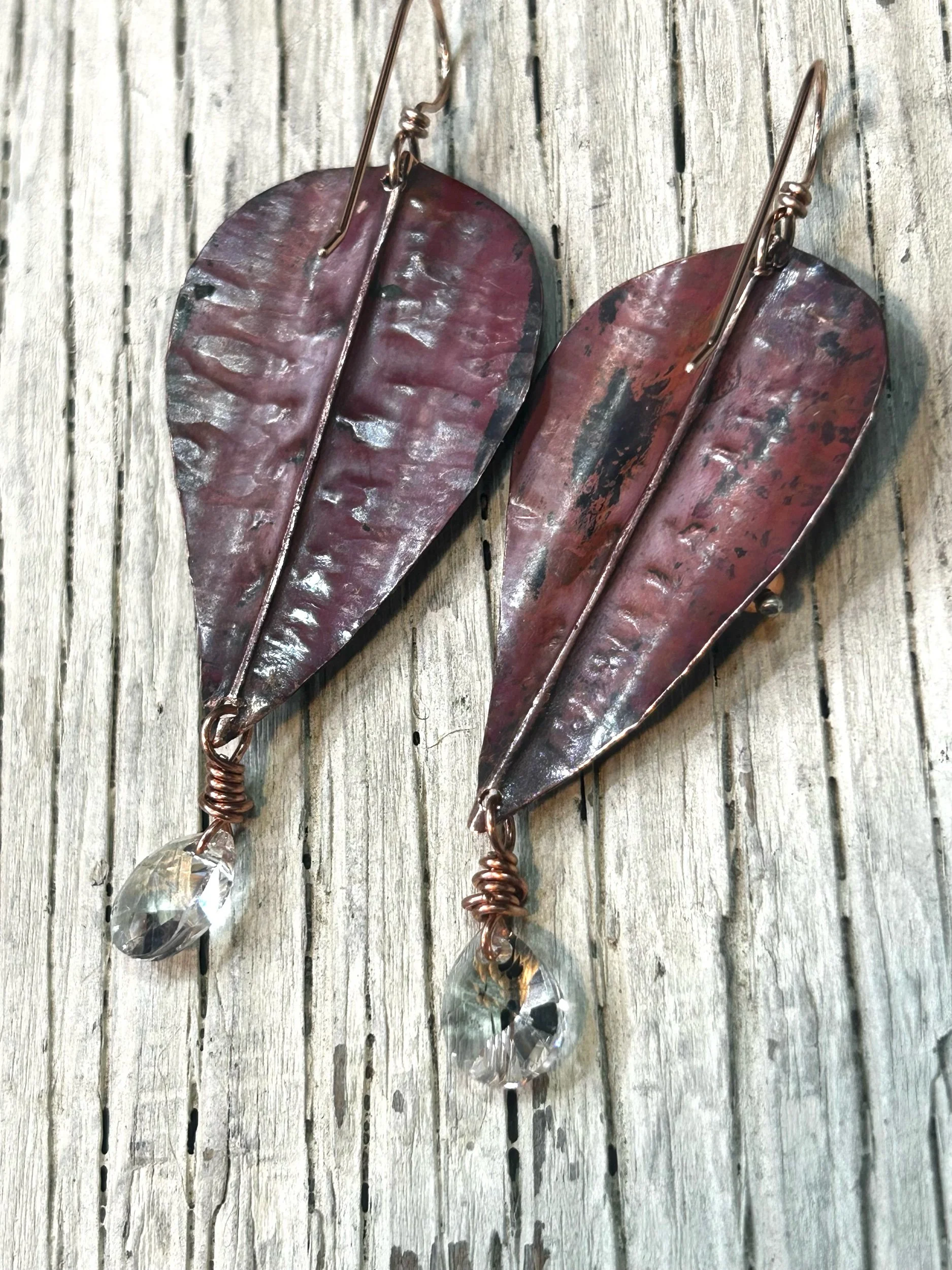 Made from very thin gauge Copper sheet metal, these leaves have been hand cut, flame treated to bring out the colors from oxidation, folded, hammered and formed. A sparkling Swarovski crystal drop hangs from the bottom as well as the center, suspended from handmade French hook style 14kt Rose Gold-filled ear wires. Weighing in at approximately 4 grams per earring, these guys make a light tinkling sound due to freely moving dangles. One of a kind and ready to ship.