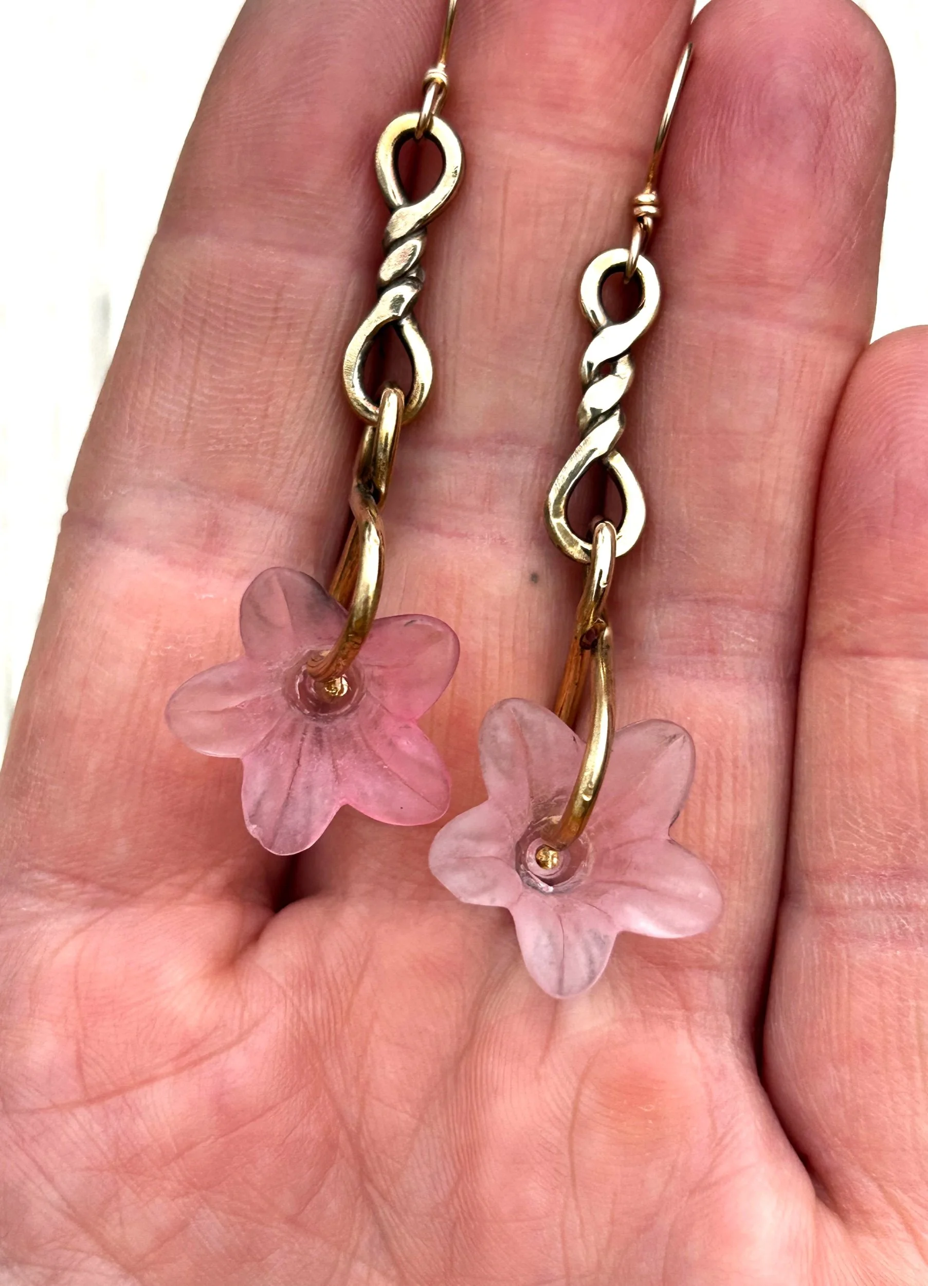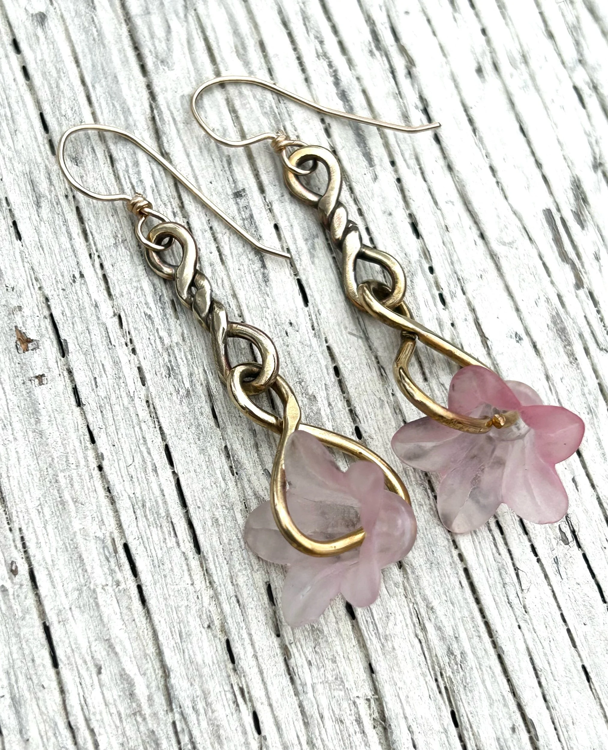 vintage Lucite flowers in pale pink, wrapped up in brass wire and hung from brass Infinity chain links with 14kt gold filled ear wires. Approximately 3 grams per earring. Ready to ship.