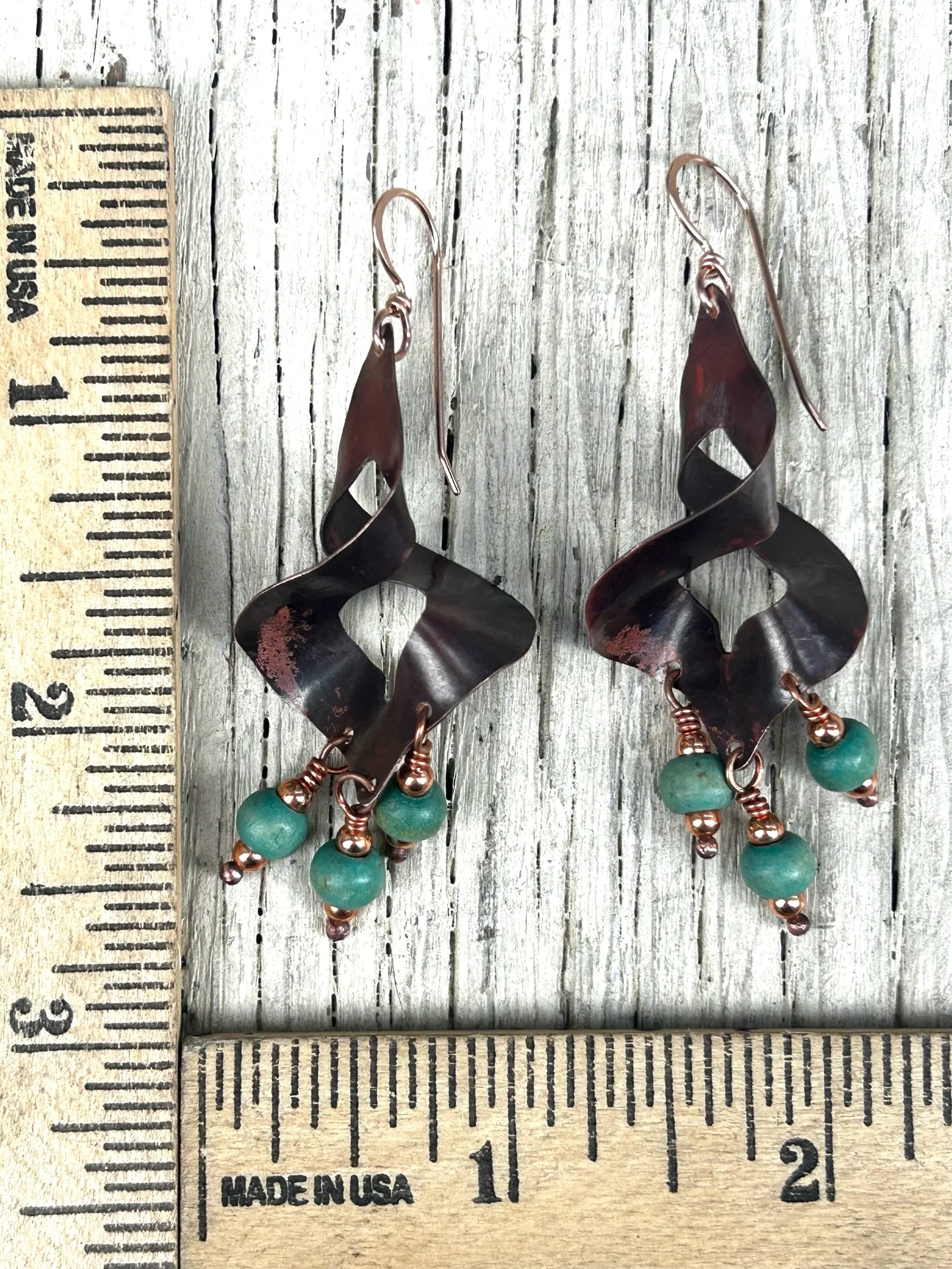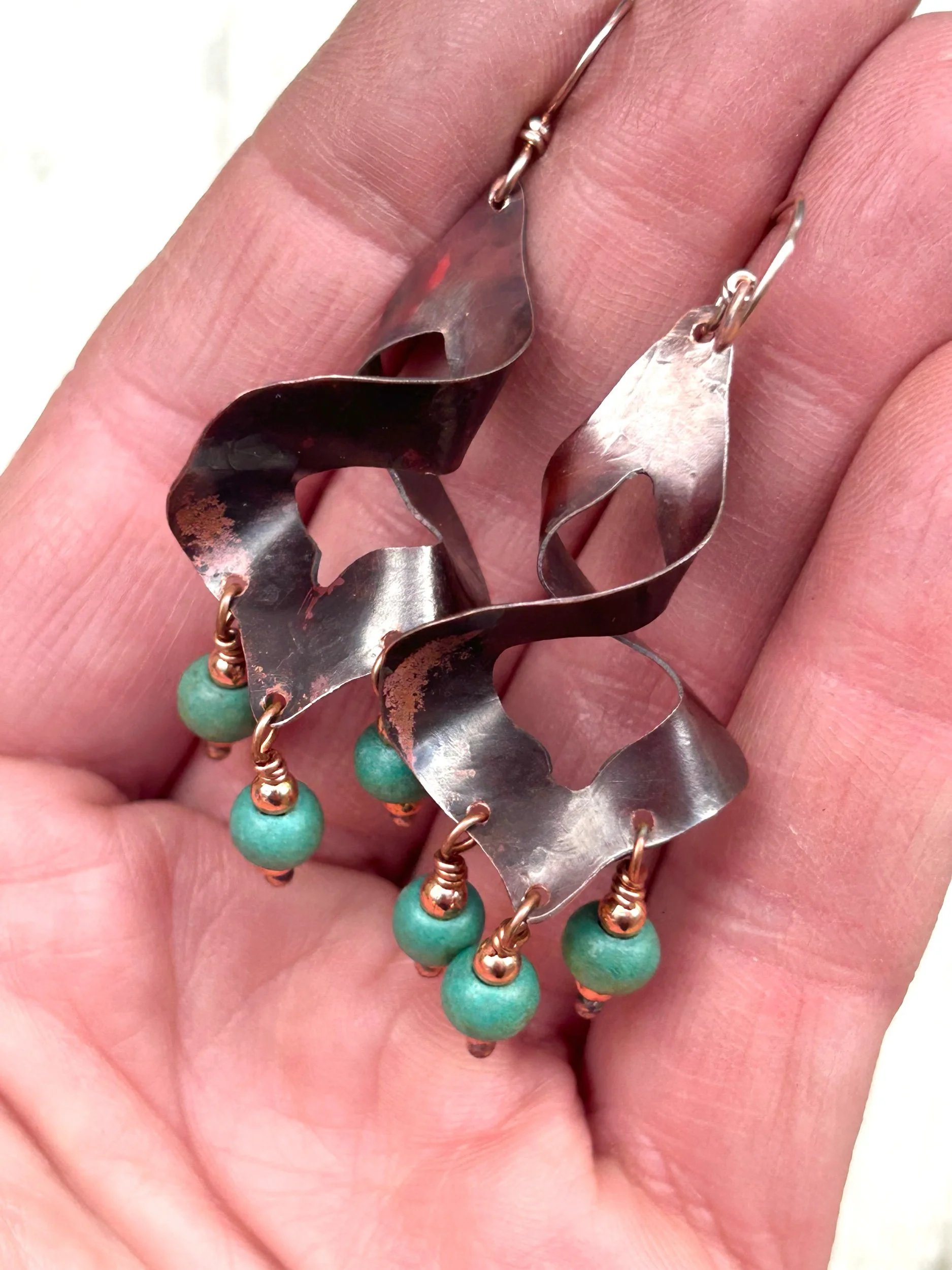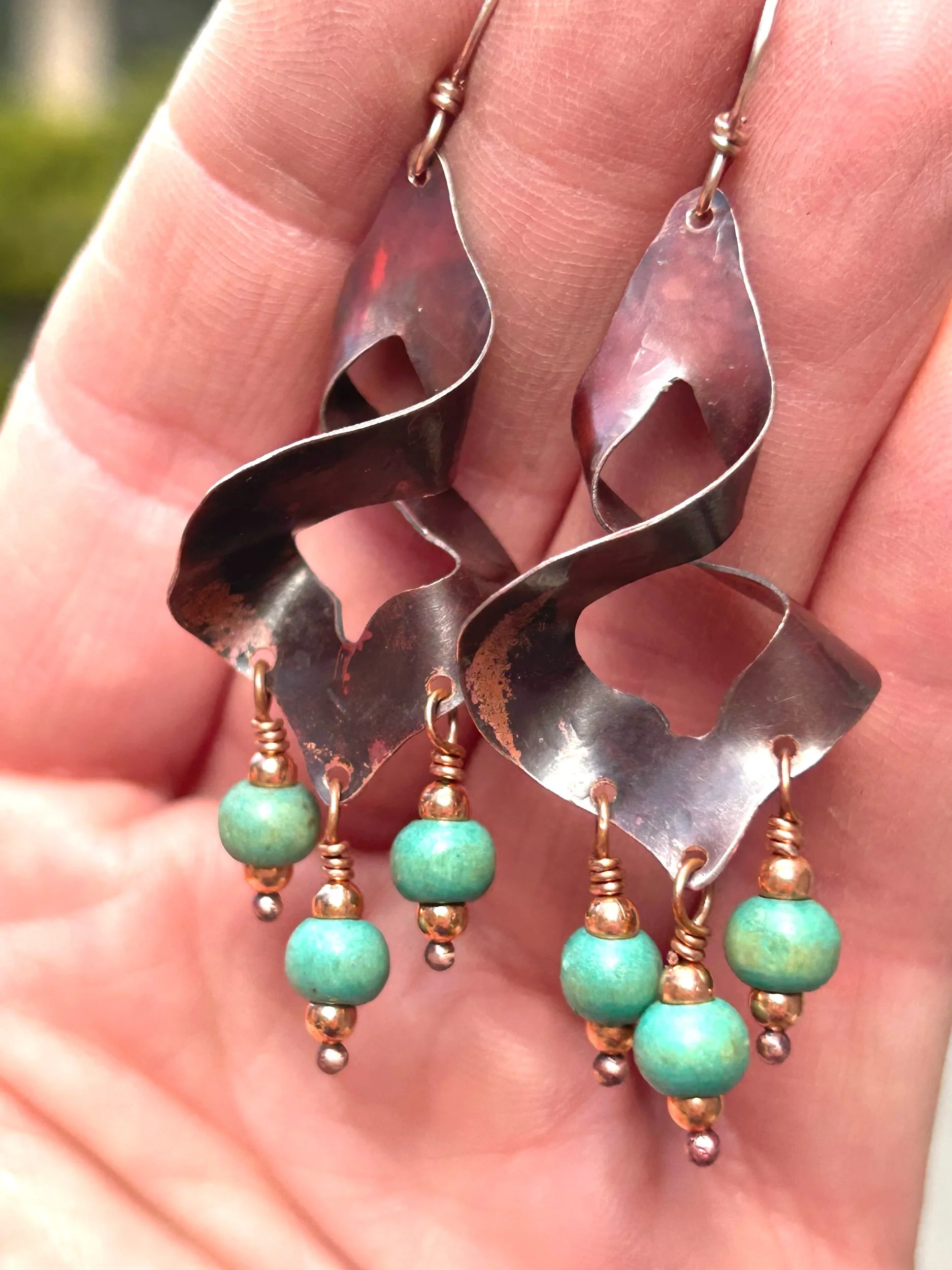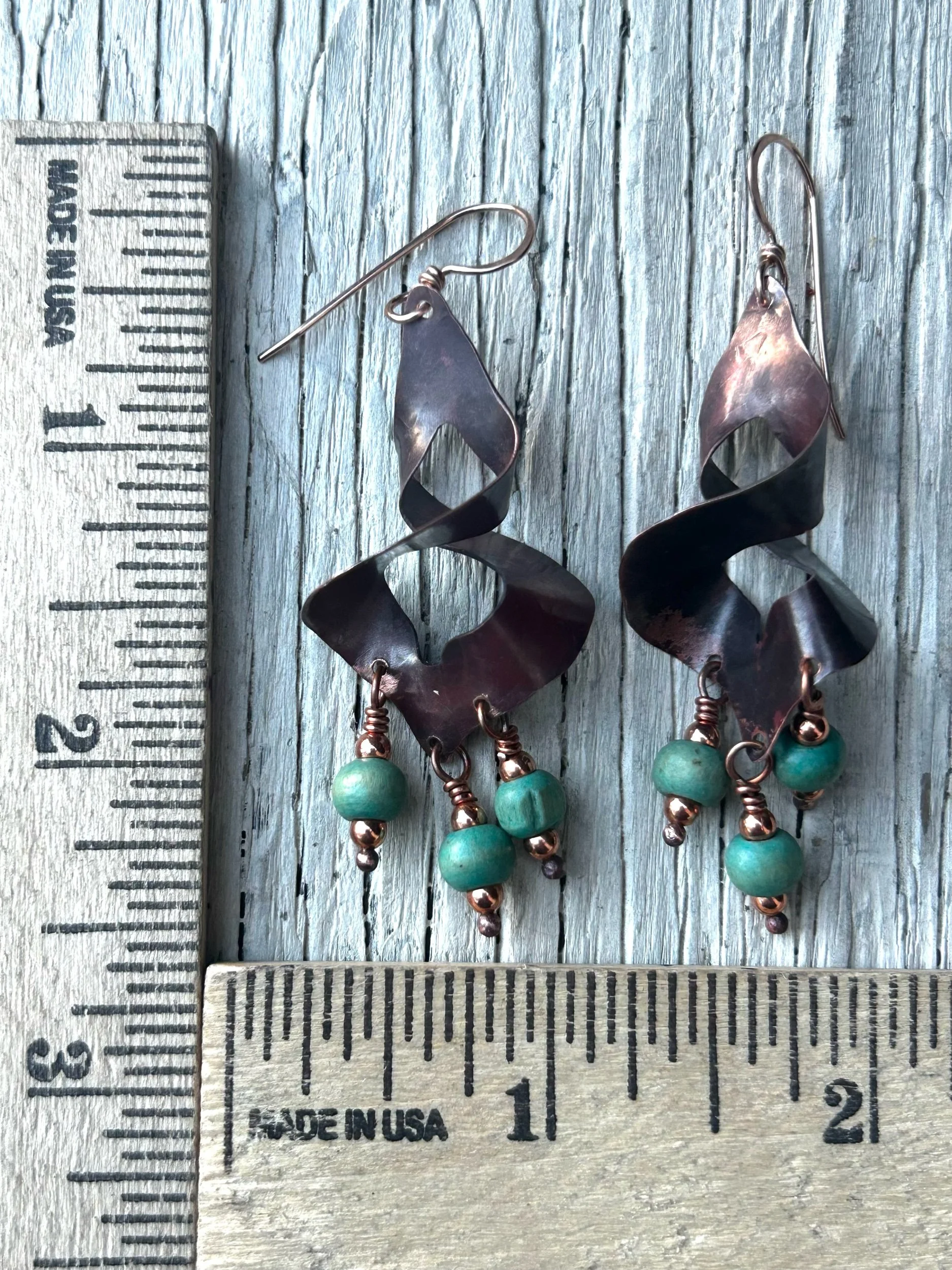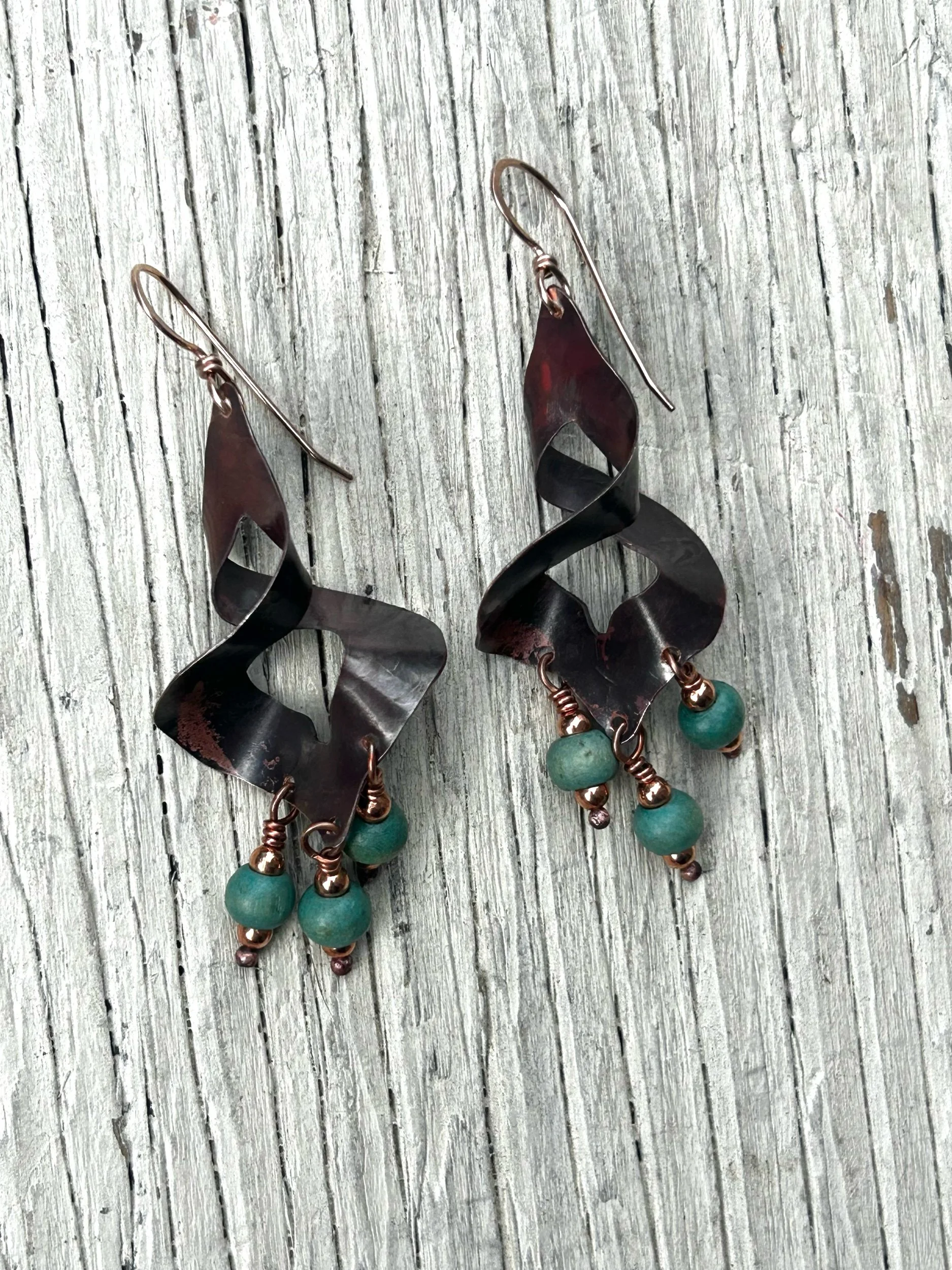 Thin copper sheet that’s been cut to shape, hammer-textured, heat-treated to bring out the colors from oxidation, twisted and formed. Dangles of vintage painted wooden beads, with handmade 14kt Rose Gold-filled French hook style ear wires. Each piece weighs approximately 3 grams. One of a kind and ready to ship.