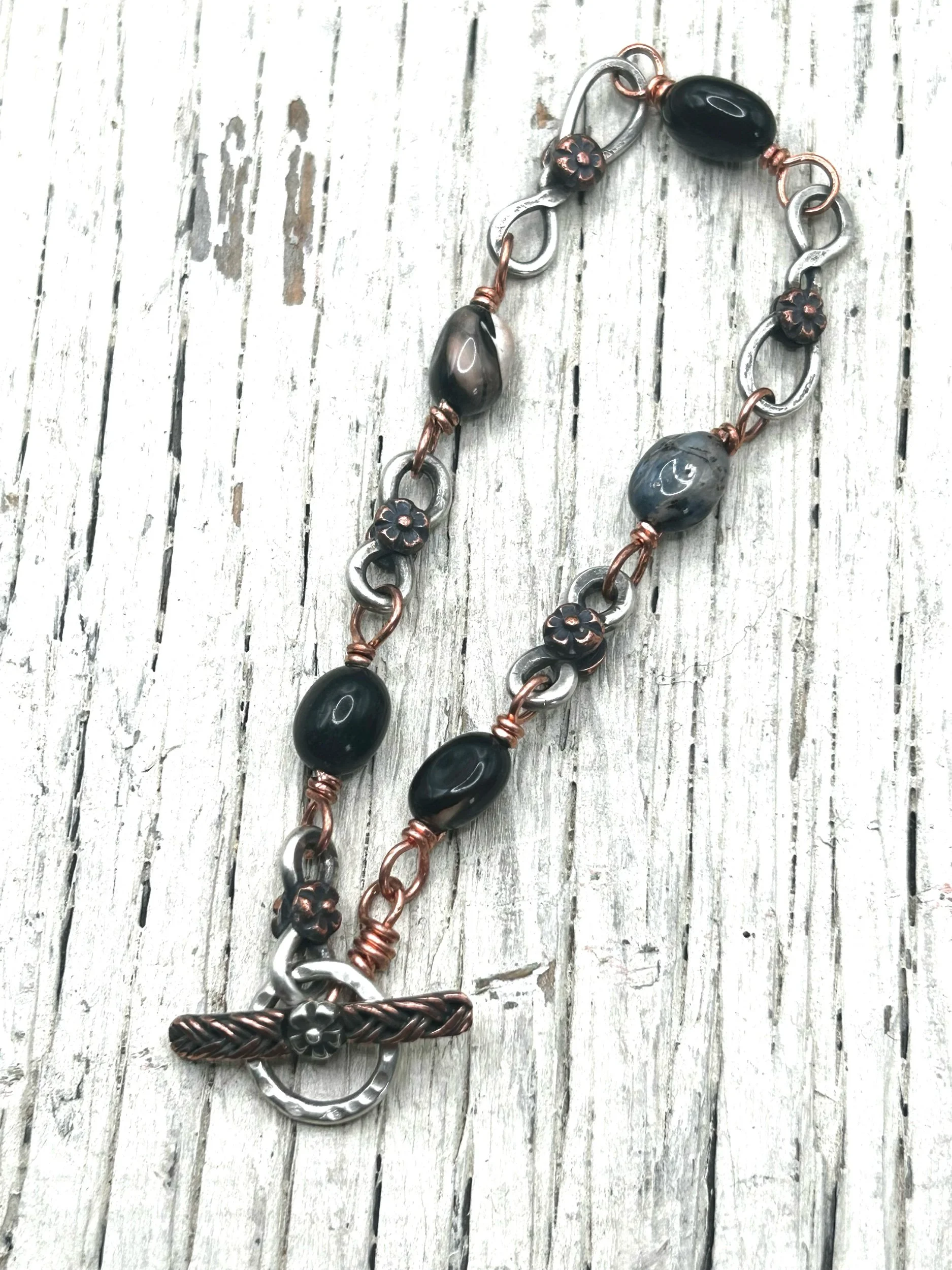Agate beads in shades of cream, black, & grey are wired up with copper and Sterling Silver Infinity chain links and the sweetest little hand-formed copper flowers. Handmade toggle clasp with lots of detail in braided copper wire. Bracelet is approximately 8” in length, one of a kind, and ready to ship.