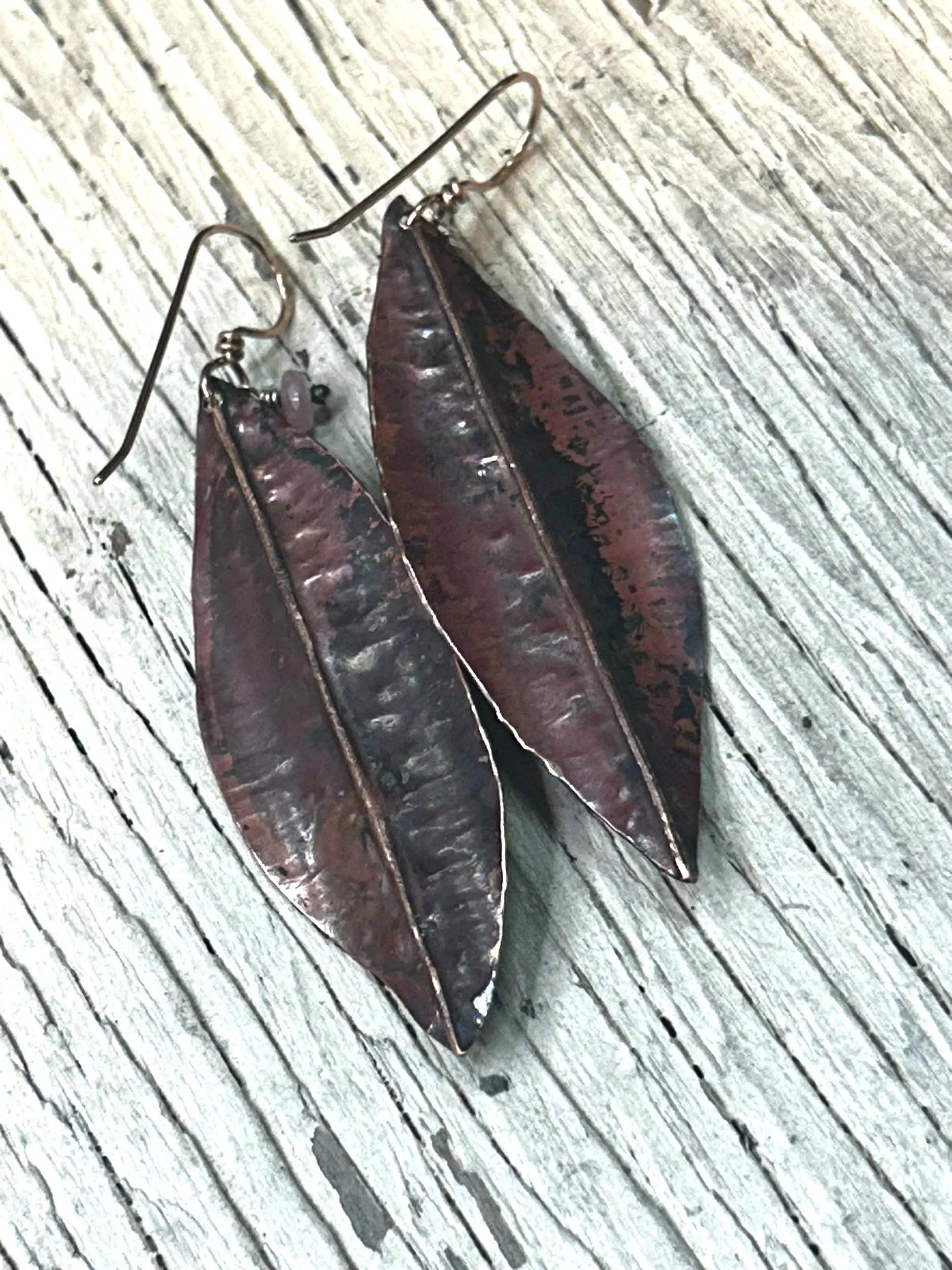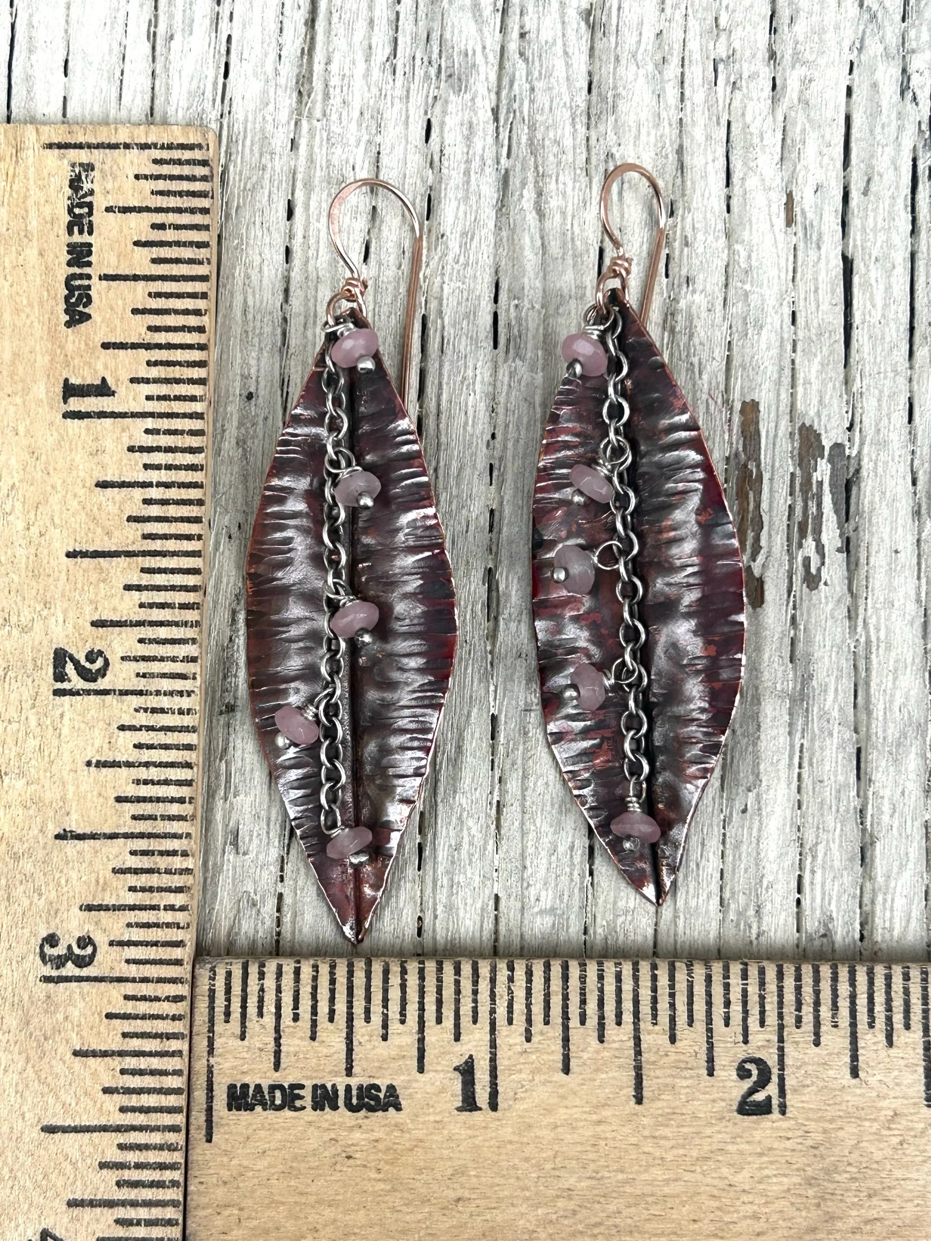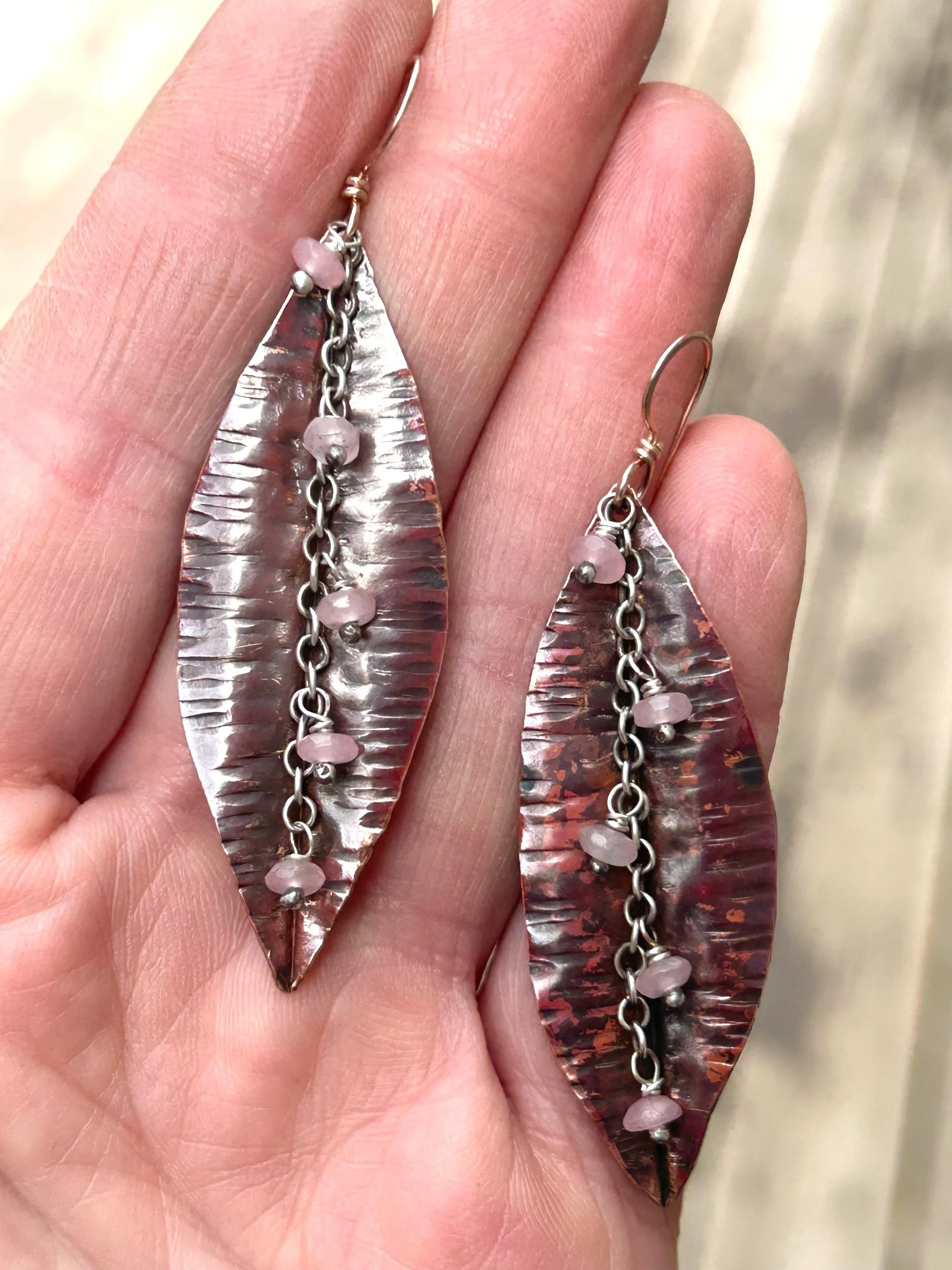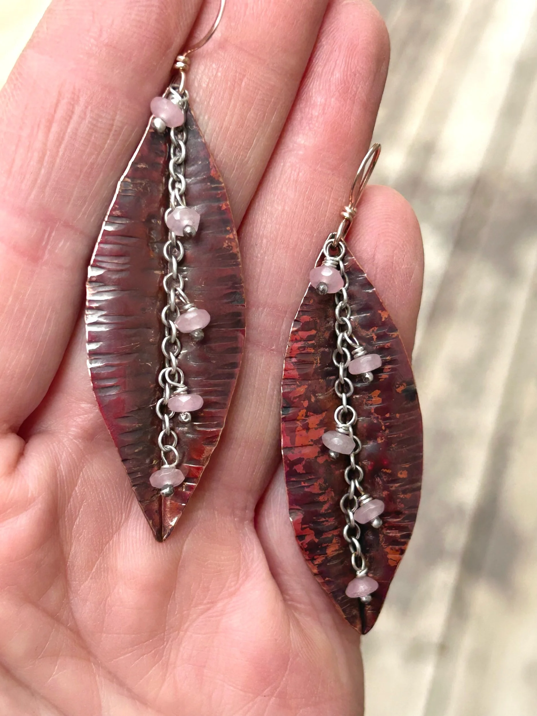 Made from very thin gauge Copper sheet metal, these leaves have been hand cut, flame treated to bring out the colors from oxidation, folded, hammered and formed. Sterling Silver chains, dotted with Rose Quartz beads, hang from handmade French hook style ear wires in 14kt Rose Gold-filled wire. The freely dangling chain makes light tinkling noises and each earring weighs approximately 4 grams each. In stock and ready to ship.